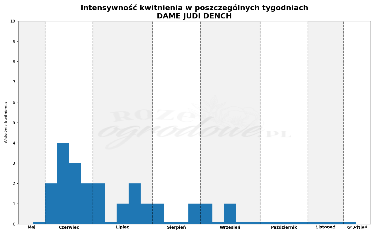 Jak wiele róż angielskich Dame Judi Dench jest różą wczesną, pierwsze kwiaty pojawiły się wraz z czerwcem a szczyt kwitnienia nastąpił szybko, już w drugim jego tygodniu. Kwitnienie trwało pięć tygodni, w najwyższym punkcie kwitło 40% pąków. Po krótkiej przerwie w drugim tygodniu lipca, zakwitła ponownie. Kwitnienie było już delikatniejsze i trwało cztery tygodnie. Pojedyncze kwiaty pojawiały się także od końca sierpnia do połowy września.
