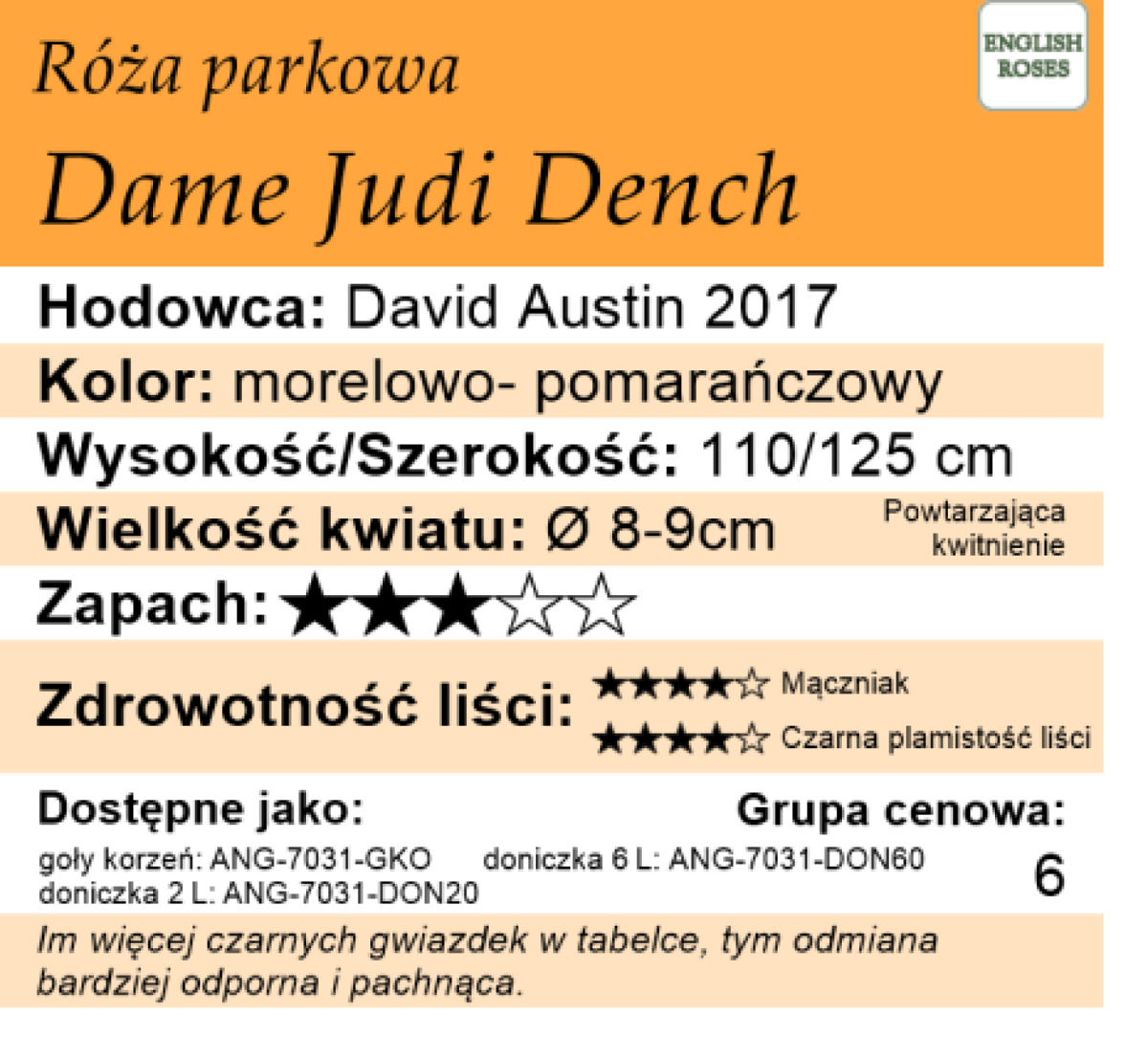 Dame Judi Dench została wprowadzona na rynek w 2017 roku i jest klasycznym przykładem „Róży Angielskiej” – łączy w sobie urok starych róż z wigorem i powtarzalnością kwitnienia róż nowoczesnych. Tworzy średniej wielkości krzewy.