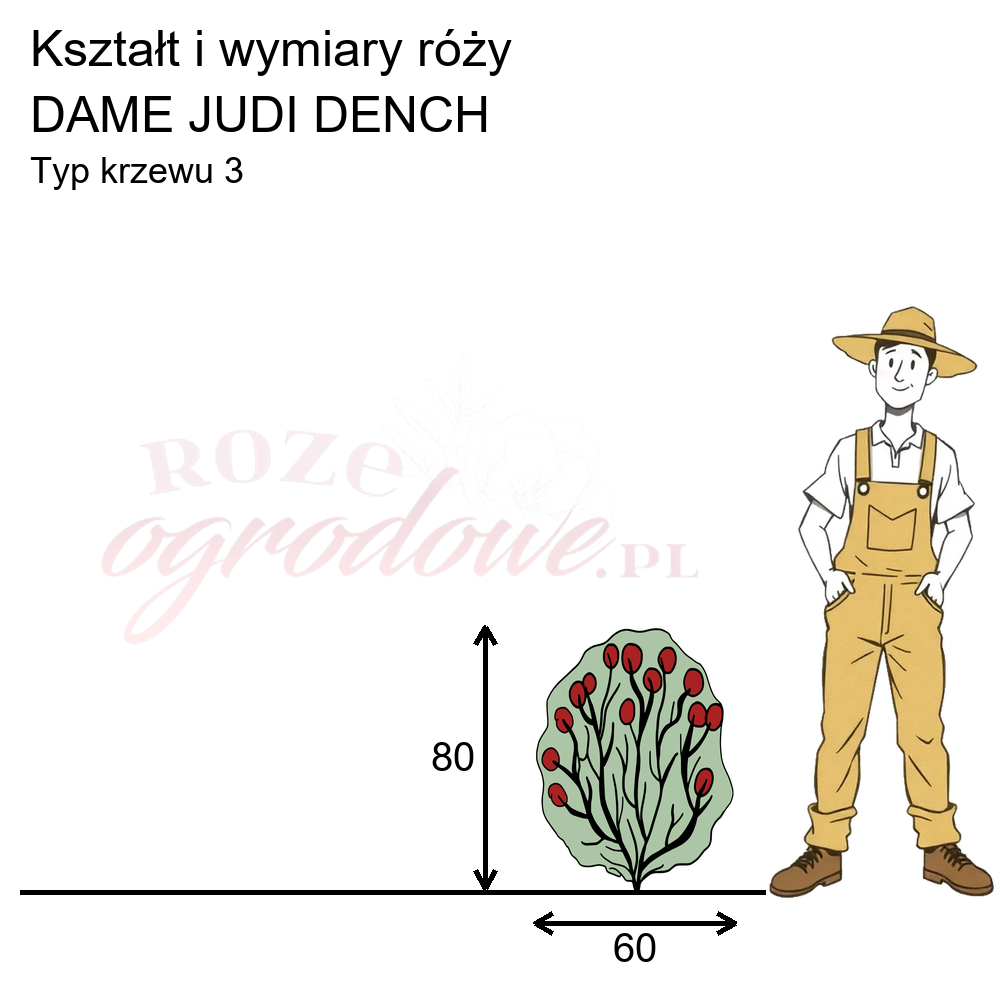 Rysunek przedstawia wymiary i pokrój angielskiej róży parkowej Dame Judi Dench na podstawie naszych wewnętrznych obserwacji 3-letniego krzewu rosnącego na terenie szkółki, w Żywym Katalogu Róż. Zaklasyfikowaliśmy tę różę do typu 3. z 17. różnych typów opisowo-obrazkowych, które opracowaliśmy by pomóc w lepszym doborze róż. Można je zobaczyć tutaj: https://www.rozeogrodowe.pl/pl/i/TYPY-ROZ/53