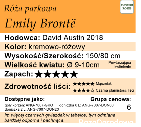 Emily Brontë jest to silna, odporna i pełna wigoru angielka o bardzo trwałych kwiatach. Ma bardzo delikatny kolor, który raczej przedstawia się jako biało-różowy z ciemniejszy morelowo-żółtym środkiem. W pąku lawendowo-różowy po morelowy.