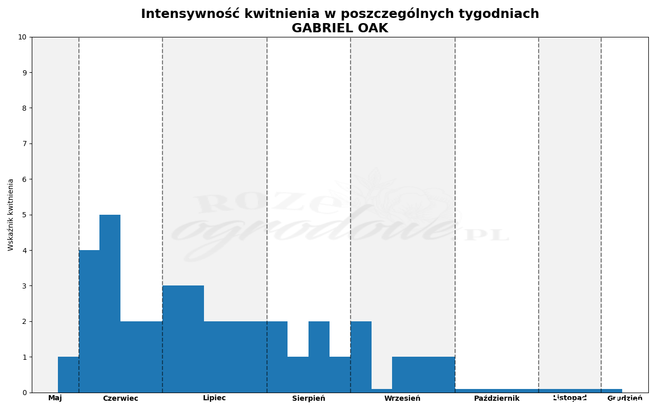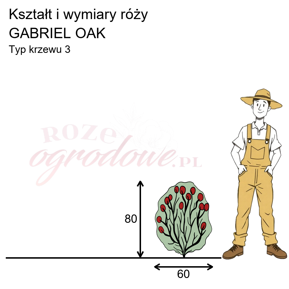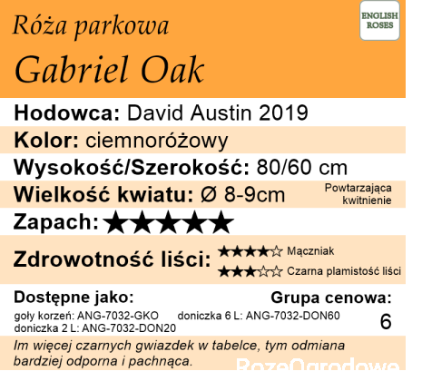 Róża 'Gabriel Oak' to wspaniała nowość, która zadebiutowała w 2019 roku. Jest to róża, która robi ogromne wrażenie swoją siłą, kolorem i charakterem. Nowa, pełna wigoru róża angielska o mocnym, owocowym zapachu. Zapach jest silny i wspaniały. Jest to klasyczna woń starej róży z intrygującą nutą owocową i korzenną.