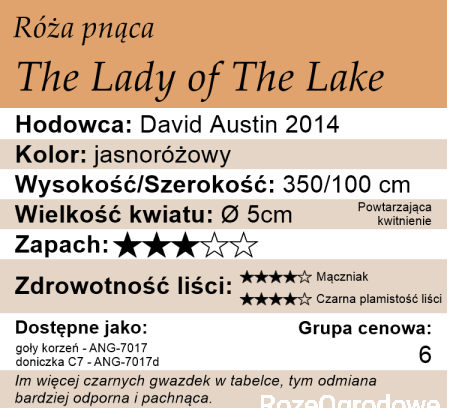 The Lady of The Lake - róża o charakterze wzrostu ramblerów. Tworzy długie, mocne ale elastyczne pędy, które dają się łatwo formować.
