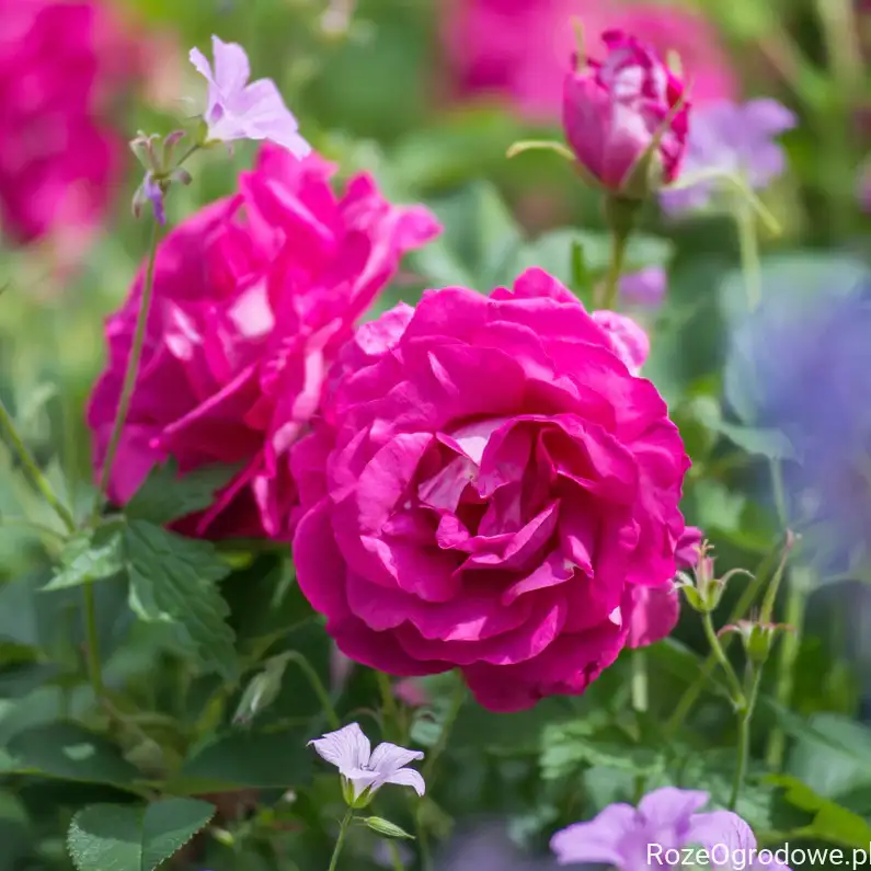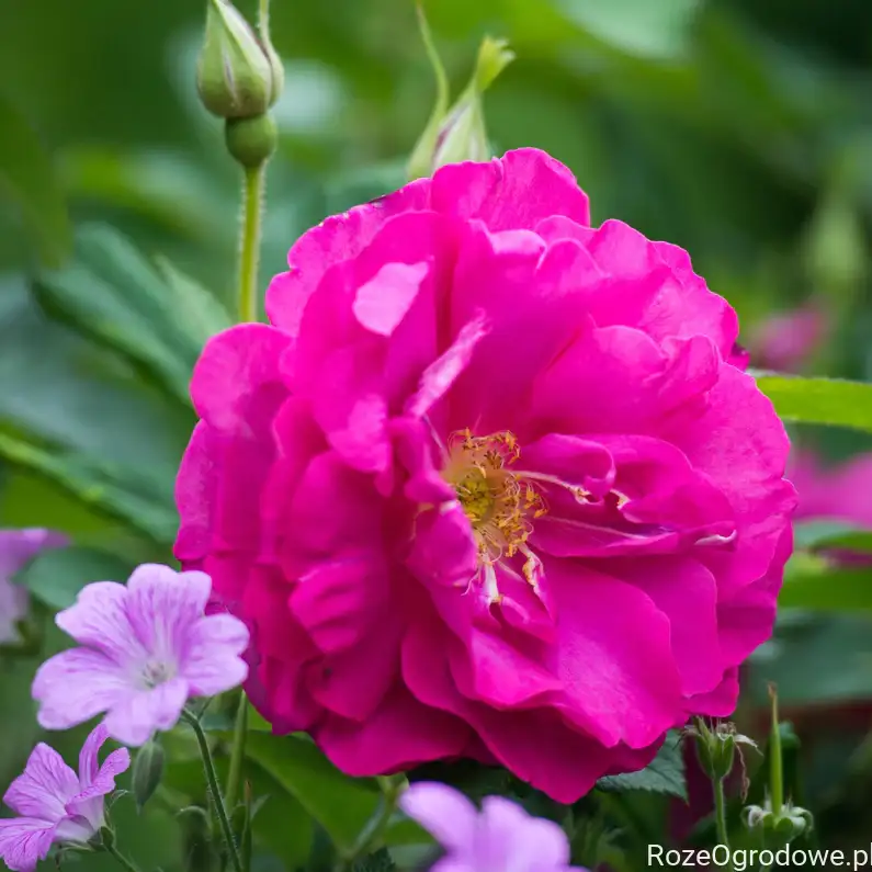 Spiczaste pąki otwierają się na półpełne kwiaty o aksamitnym, bogatym różu, odsłaniające złote pręciki. Widać w nich pęk pięknych, złocistych pręcików.Kwiaty mają głęboki, aksamitny odcień purpurowo-różowy (wpada w fiolet), który w miarę przekwitania jaśnieje.