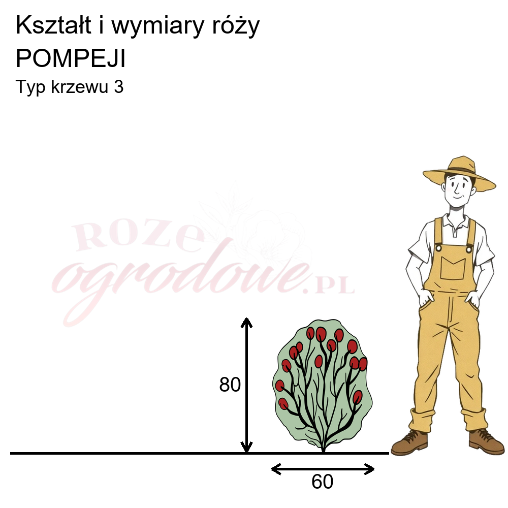 Rysunek przedstawia wymiary i pokrój róży miniaturowej Pompeji na podstawie naszych wewnętrznych obserwacji 3-letniego krzewu rosnącego na terenie szkółki, w Żywym Katalogu Róż. Zaklasyfikowaliśmy tę różę do typu 3. z 17. różnych typów które opracowaliśmy by pomóc w lepszym doborze róż. Resztę typów można zobaczyć tutaj: https://www.rozeogrodowe.pl/pl/i/TYPY-ROZ/53