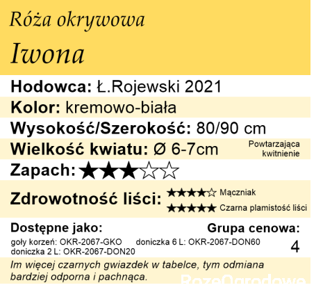 Iwona- to kolejna bardzo ciekawa odmiana polskiego hodowcy- Łukasza Rojewskiego. Nazwa tej odmiany została nadana na cześć jego żony- Iwony, co dobitnie pokazuje jak cenna dla hodowcy jest ta róża.