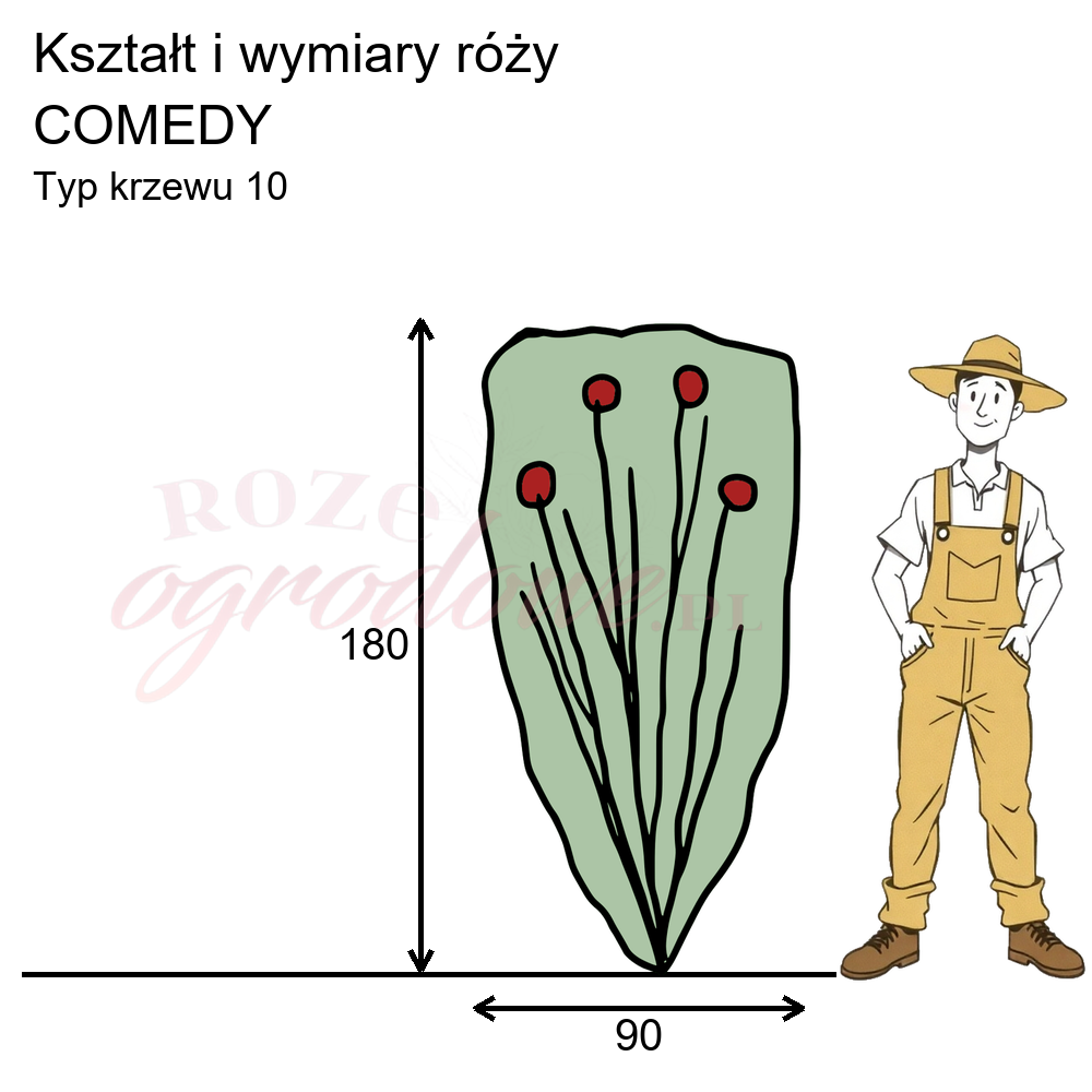 Comedy - to mocno rosnąca róża krzaczasta, pełna wigoru i obficie kwitnąca. Jej silne, wyprostowane pędy zdobią ładne, zdrowe, błyszczące liście. Na końcach pędów rozwijają się okazałe kwiatostany. Od połowy czerwca rozpoczyna on kolorowy spektakl, prezentując czerwonawe pąki kwiatowe, które w trakcie rozwijania ukazują złoto-żółte wnętrze. Brzeg żółtych płatków pozostaje wybarwiony na czerwono, a w czasie przekwitania cały kwiat delikatnie jaśnieje.