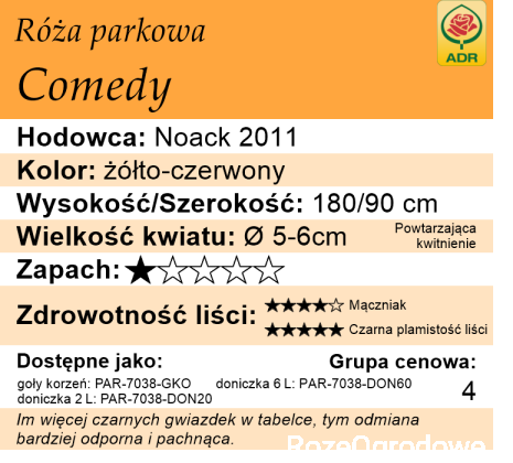 W porównaniu do innych róż parkowych o złotopomarańczowym kolorze, Comedy wyróżnia się najbardziej wyrazistymi barwami. Choć przypomina nieco rabatową odmianę Gartenspass, to jednak posiada piękniejsze, błyszczące liście. Jeśli marzysz o wyrazistej, dużej, i zdrowej różanej ozdobie ogrodu w kolorze złoto-herbacianym, zastanów się między Comedy a Landlust. Comedy jest nieco bardziej żółta, podczas gdy Landlust jest bardziej łososiowy w momencie przekwitania. Obydwie odmiany są liderami pod względem zdrowotności, a Comedy posiada nawet certyfikat ADR. Nie bez powodu Comedy cieszy się ogromną popularnością wśród róż parkowych od Noack Rosen.
