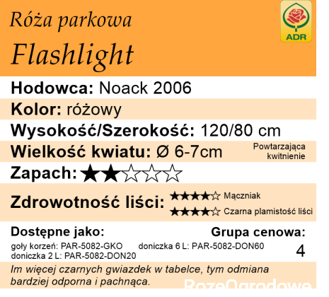 Ta niewysoka róża parkowa wyszła spod ręki jednego z najlepszych hodowców współczesnych. Dodatkowo firma Noack Rosen bardzo starannie prowadzi selekcję i na rynek wypuszcza tylko wyjątkowo dobrze przetestowane odmiany. Flashlight zdał ten egzamin bardzo dobrze, a potwierdzeniem tego jest certyfikat ADR przyznany mu w 2006 roku. Jest to bowiem róża bardzo zdrowa, dobrze się rozkrzewiająca, obficie kwitnąca.