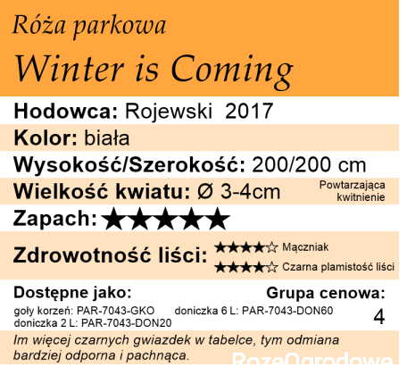 Winter is Coming syn. Pegasus - różana maszyna, którą wystarczy posadzić i zapomnieć. ‘Winter is Coming’ pokryta jest lekkimi i białymi jak śnieg kwiatami, które poruszane wiatrem, do złudzenia przypominają rozłożone skrzydła. Chmura drobnych kwiatów zdaje się wisieć w powietrzu. Złudzenie potęgują wyciągnięte łodygi kwitnące szerokimi baldachami. Ten nowy typ róży trudno jednoznacznie zakwalifikować. Jednocześnie widać cech róży rabatowej i multiflora. Pięknie prezentuje się również jako róża pnąca. Przymocowana do podpory osiągnie wzrost do trzech metrów. Pachnie zmysłową nutą kwiatową z odrobiną lipowej słodyczy. Odurzający jaśminowiec w asyście suszonej łąki po deszczu. Złota róża w Międzynarodowym Królewskim Konkursie Nowości Różanych w Belgijskim Ville du Roeulx (Royal Concours International de Roses Nouvelles de la Ville du Roeulx) oraz złoty medal w kategorii róż parkowych.