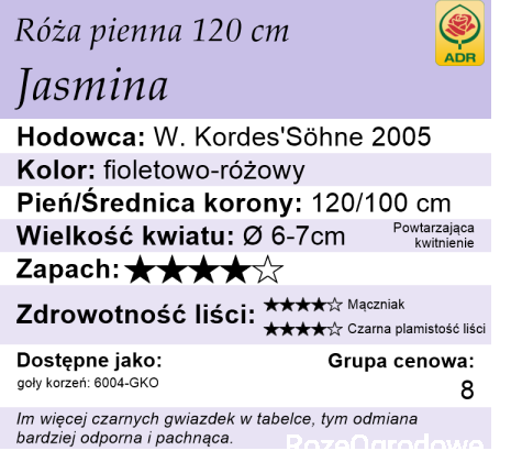 Ogromną zaletą tej odmiany jest to że mimo swej delikatności cechuje ja wysoka odporność na czarną plamistośc liści jak i mączniaka. Wszystkie walory Jasminy sprawiły że przyznano jej znak ADR.