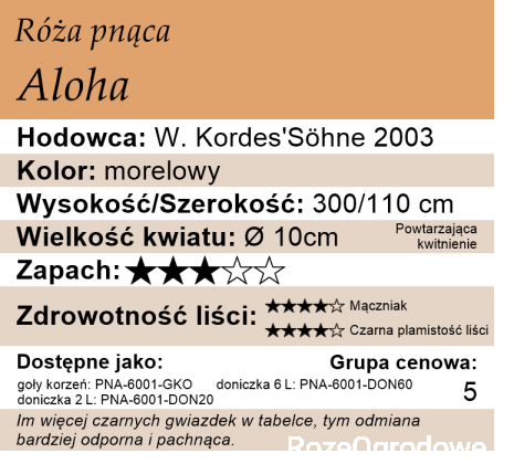 Mam tę różę od 2014 r. Rośnie zdrowo, ma dużo silnych, kolczastych pędów. Kwiaty pięknie wybarwione, pachnące. Niestety nie mam jeszcze dużego doświadczenia w uprawie róż i jak na razie Aloha nie odwdzięcza się obfitym kwitnieniem. Kwiatów jest mało i są nietrwałe. Na razie mam więc ogromne, kolczaste krzaczysko bardziej przydatne na zasieki niż na różę ozdobną. Wydaje mi się, że jest to róża dla bardziej doświadczonych ogrodników, nie dla amatorów. Pozdrawiam.