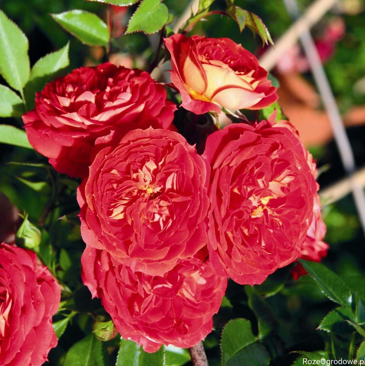 Róża pnąca Carmen- wyjątkowy, ognisty, letni kolor to główny atut tej mini pnącej róży.