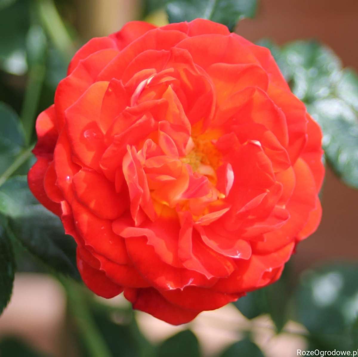 Intensywny pomarańczowo-czerwony kolor jest zaakcentowany od spodu płatków kontrastującą żółtą barwą, co dodatkowo wyróżnia i przyciąga wzrok z daleka.