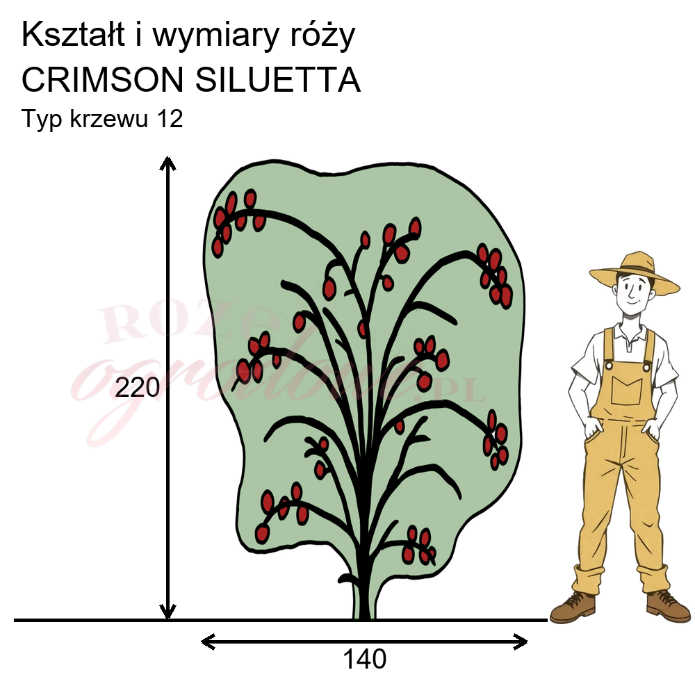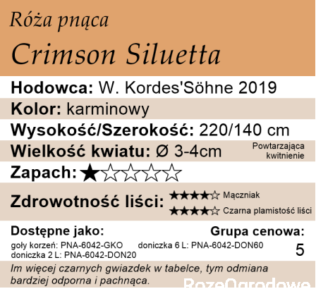 Crimson Siluetta to czerwony rambler powtarzający kwitnienie, który osiąga niewielkie rozmiary, ale za to obficie kwitnie. Kwiaty zebrane w grona być może nie są tak duże jak u innych klasycznych róż pnących, natomiast wynagradzają to obfitością kwitnienia, a przede wszystkim pięknym, trwałym kolorem.