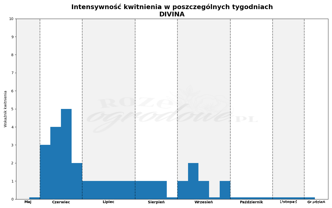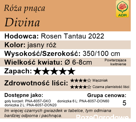 Dlaczego więc kolejna różowa róża pnąca? To pytanie z pewnością postawili sobie w firmie Rosen Tantau, dlatego długo zwlekali z wprowadzeniem tej róży na rynek. Dopiero przyznanie jej certyfikatu ADR przesądziło o tym, że w 2022 roku została oficjalnie zaprezentowana. Co ciekawe, niespodziewanie zdobywa ona popularność wśród ogrodników. Być może dzieje się tak dlatego, że oprócz mocnego wzrostu, dużego wigoru i odporności na choroby grzybowe oferuje coś, czego tak naprawdę najbardziej poszukujemy. Divina bowiem ma w swoich kwiatach jakiś subtelny romantyzm. Te dość duże, pełne, jasnoróżowe kwiaty mocno i przyjemnie pachną.