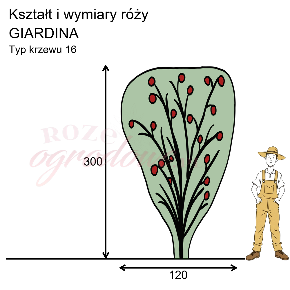 Rysunek przedstawia wymiary i pokrój róży pnącej Giardina na podstawie naszych wewnętrznych obserwacji 3-letniego krzewu rosnącego na terenie szkółki, w Rosarium. Zaklasyfikowaliśmy tę różę do typu 16. z 17. różnych typów opisowo-obrazkowych, które opracowaliśmy by pomóc w lepszym doborze róż. Można je zobaczyć tutaj: https://www.rozeogrodowe.pl/pl/i/TYPY-ROZ/53