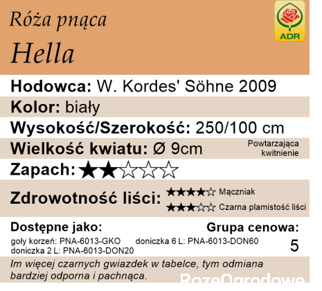 Czysto biała róża pnąca wprowadzona na rynek przez firmę Kordes w 2009 roku. Nazwa odmiany została dedykowana wieloletniej dyrektorce Sangerhauser Rosarium, pani Helli Brumme. Jest to climber dorastający do 250 cm o wiotkich, drobnych pędach w czym bardzo przypomina ramblery. Niezbyt grube pędy gęsto pokrywają kolce. Liście całkowicie pokrywają krzew i choć nie są zbyt duże, oliwkowozielone to stanowią piękne tło dla czysto białych półpełnych kwiatów, które otwierając się ukazują żółte pręciki. Zakwita dużymi kwiatostanami a po przekwitnięciu sama oczyszcza się. Dobrze powtarza kwitnienie i znosi zacienienie. Wyróżnia się wyjątkową odpornością na choroby grzybowe za co otrzymała prestiżowe odznaczenie ADR.