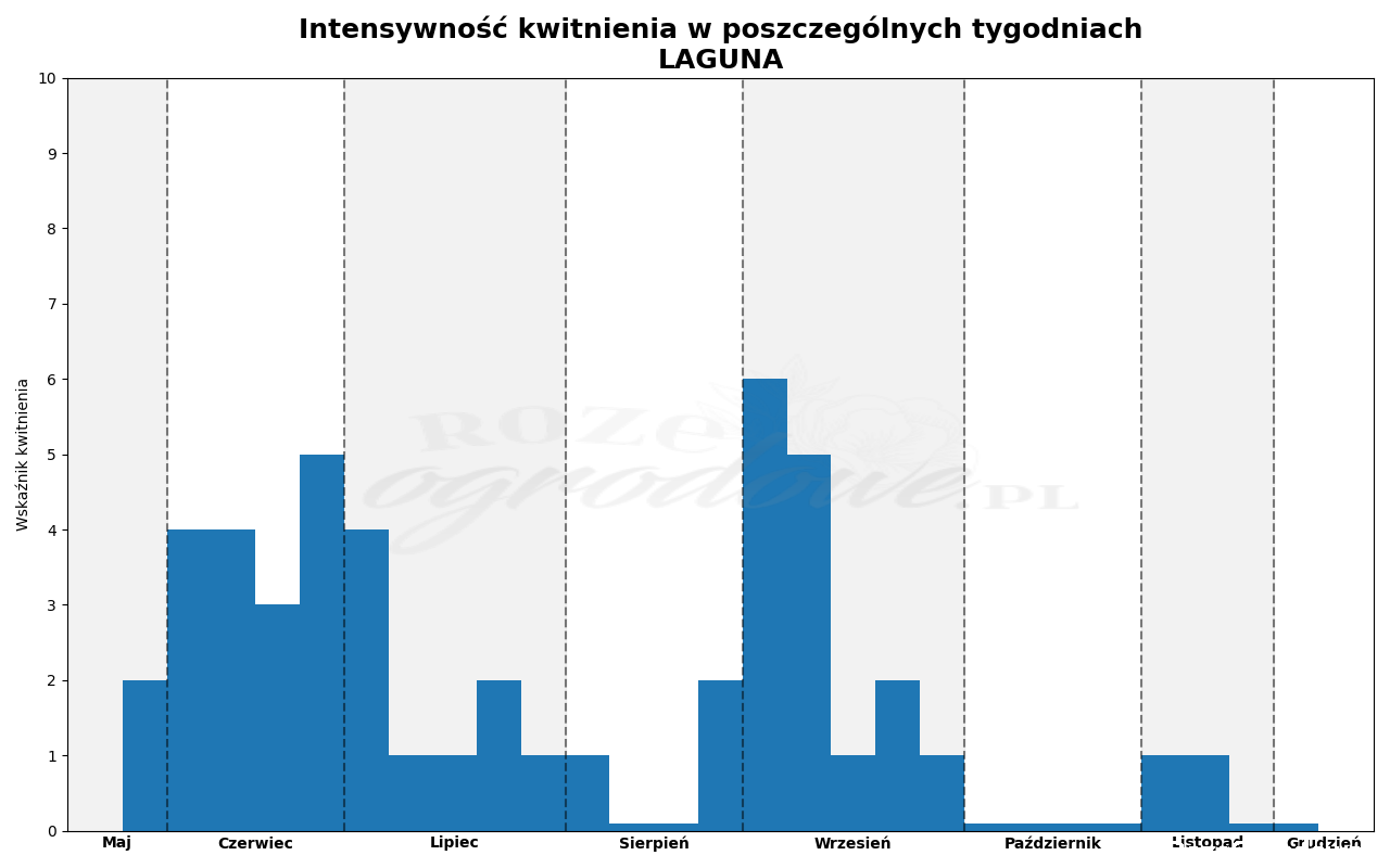 Po naszych cotygodniowych obserwacjach stworzyliśmy wykres kwitnienia Laguny od maja aż do grudnia 2025. Laguna jest różą kwitnącą w normalnym terminie. W tym sezonie zakwitła w pierwszym tygodniu czerwca, standardowo, jak większość róż. Pierwsze kwitnienie trwało aż jedenaście tygodni, szczyt kwitnienia przypadł na ostatni tydzień czerwca, ale w całym czerwcu i na początku lipca kwiatów było cały czas dużo. Później, przez kolejny miesiąc pojawiały się w niewielkiej ilości, do 20%, aż do całkowitej, dwutygodniowej przerwy w sierpniu. Od ostatniego tygodnia sierpnia zakwitło 20% pąków i bardzo szybko, w pierwszym tygodniu września pojawił się drugi pik, mocniejszy niż za pierwszym razem co jest sytuacją nietypową dla róż pnących. Drugie kwitnienie było rozciągnięte na sześć tygodni, z mocnym kwitnieniem w pierwszej połowie września. Po przerwie w październiku, w listopadzie pojawiały się pojedyncze kwiaty. Wykres kwitnienia Laguny nie jest typowym wykresem róży pnącej, przypomina bardziej różę rabatową która kwitnie dwoma lub trzema rzutami. Większość róż pnących kwitnie mocniej raz na początku sezonu a później stabilnie.