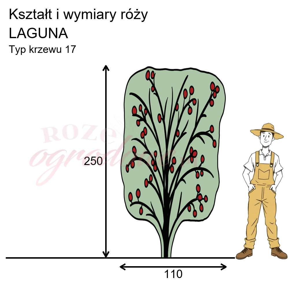 Rysunek przedstawia wymiary i pokrój róży pnącej Laguna na podstawie naszych wewnętrznych obserwacji 3-letniego krzewu rosnącego na terenie szkółki, w Rosarium. Zaklasyfikowaliśmy tę różę do typu 17. z 17. różnych typów opisowo-obrazkowych, które opracowaliśmy by pomóc w lepszym doborze róż. Można je zobaczyć tutaj: https://www.rozeogrodowe.pl/pl/i/TYPY-ROZ/53