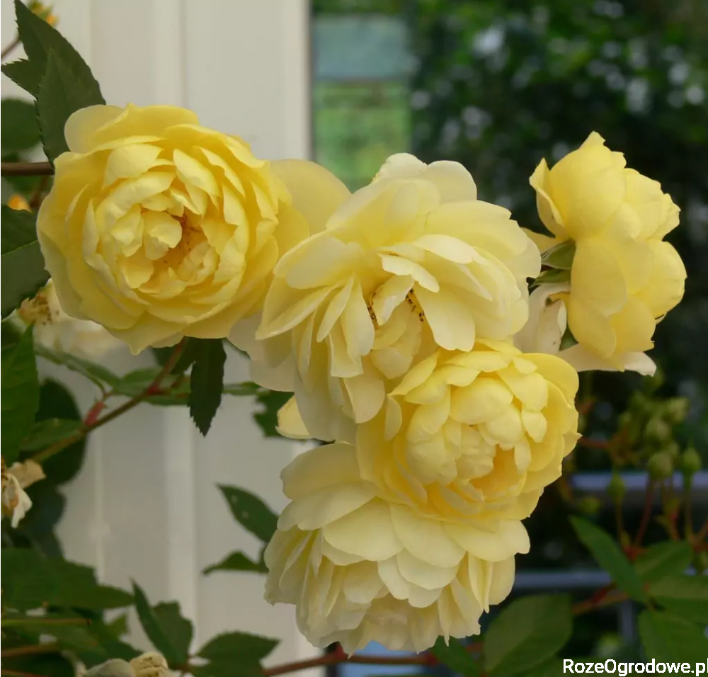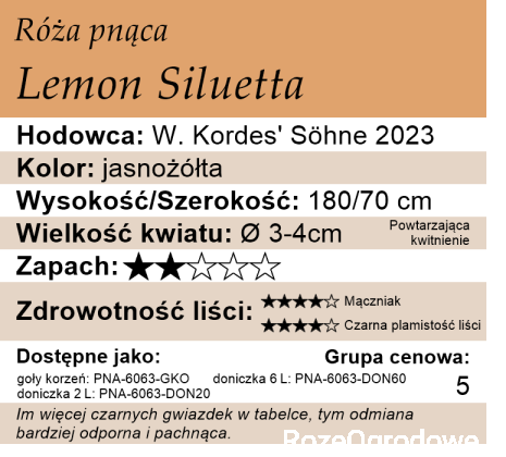 Róża pnąca Lemon Siluetta - to bardzo ciekawa propozycja, firmy Kordes. Lemon Siluetta jest miniaturowym ramblerem. Jej pędy są wiotkie, elastyczne i gęste. Dzięki temu znacznie łatwiej owijać ją wokół podpór, obelisków czy kratek w donicach – pędy dają się łatwo prowadzić. Jak sama nazwa wskazuje, ma kolor jasnocytrynowy. Jest to chłodny, pastelowy żółty, który w pełnym słońcu i w trakcie przekwitania jaśnieje do kremowo-białego. Kwiaty są małe (ok. 3-4 cm), ale pojawiają się w ogromnych kiściach. Wyglądają jak małe pomponiki. Zapach jest delikatny, subtelny.
