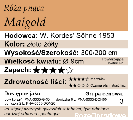 Maigold to klasyczna już odmiana róży pnącej wprowadzona na rynek przez Kordesa w 1953 roku. Krzewy tej odmiany mogą mieć okazałe rozmiary osiągając 300 cm wysokości i 200 cm szerokości, może być prowadzona również jako róża krzaczasta (parkowa). Szybko się rozrasta