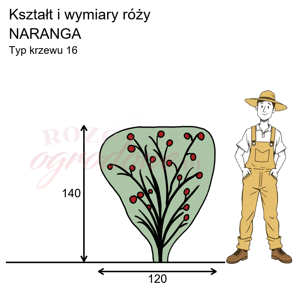Rysunek przedstawia wymiary i pokrój róży pnącej Naranga na podstawie naszych wewnętrznych obserwacji 3-letniego krzewu rosnącego na terenie szkółki, w Rosarium. Zaklasyfikowaliśmy tę różę do typu 16. z 17. różnych typów opisowo-obrazkowych, które opracowaliśmy by pomóc w lepszym doborze róż. Można je zobaczyć tutaj: https://www.rozeogrodowe.pl/pl/i/TYPY-ROZ/53