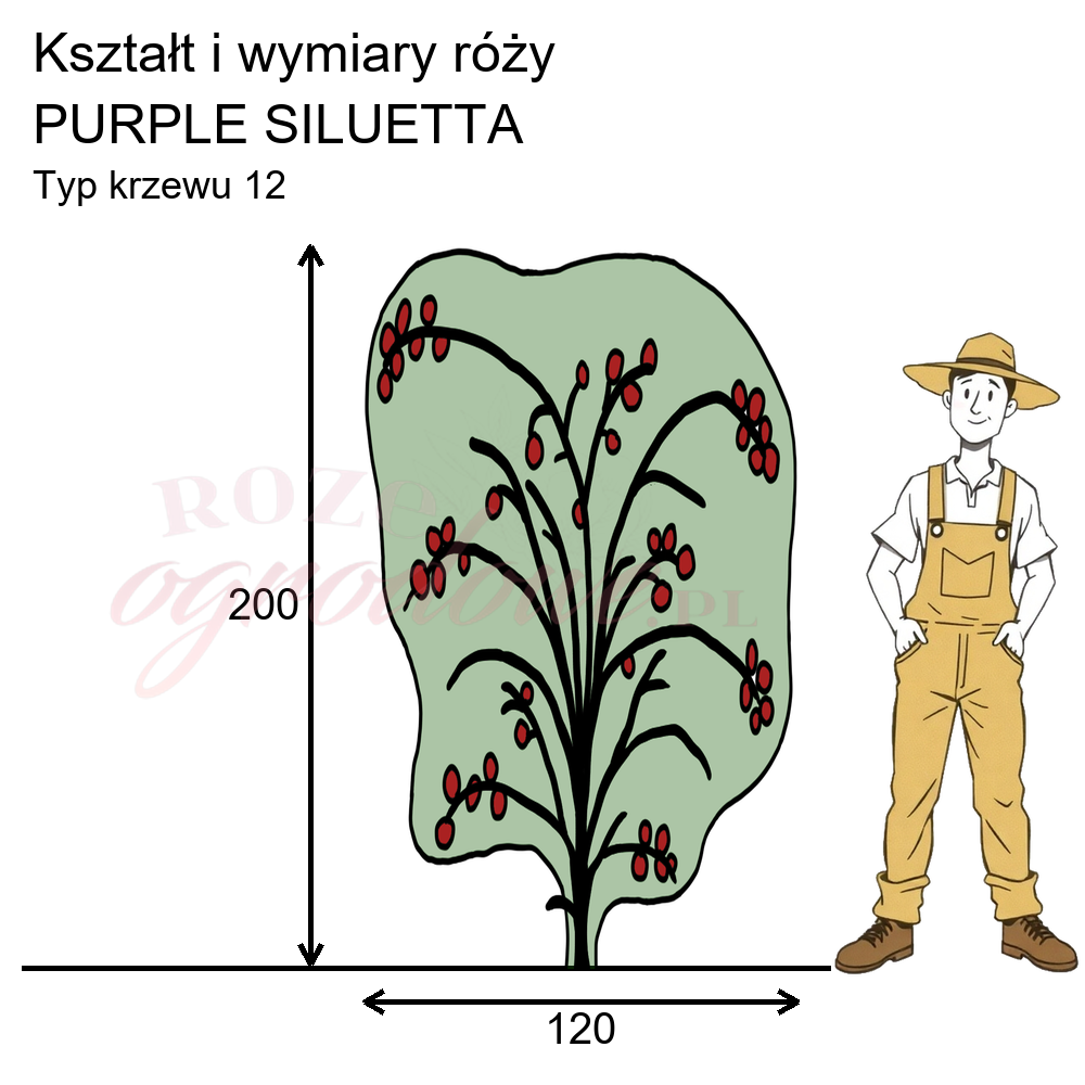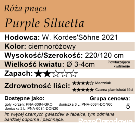 Róża pnąca Purple Siluetta - to niewysoka róża pnąca o wiotkich pędach charakterystycznych dla ramblerów. Jednak w stosunku do nich jest zdecydowanie mniejszą rośliną. Mimo swojego poskromionego wzrostu dalej odznacza się dużym wigorem. Potrafi stworzyć gęste krzewy, świetnie zarastające ogrodzenie. Ma wyjątkowo zdrowe liście, które gęsto pokrywają pędy, tworząc nieprzeniknioną ścianę. Na tle tych ciekawych, podłużnych, zdrowych liści niezwykle prezentują się kwiatostany o średniej wielkości złożone z pustych, niezbyt dużych, ale bardzo ciekawych kwiatów.