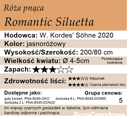 Romantic Siluetta- świetna róża do romantycznych ogrodów i zakątków ogrodowych. Nie rośnie zbyt wysoko, ma elastyczne pędy jak przystało na typowego ramblera, ale przewyższa je tym, że bardzo dobrze powtarza kwitnienie. Kwitnie baldachimami przepięknych, półpełnych kwiatów, których kolor jest zachwycający. Od różnych odcieni różu z lekkim fioletowym zabarwieniem do prawie kremowych- gdy kończą kwitnienie. Kwiaty utrzymują się długo na roślinie.