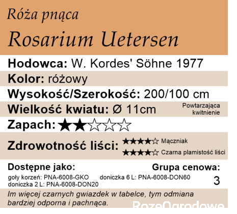 w odpowiednim miejscu praktycznie w ogóle nie choruje. Zachwyca bardzo obfitym wiosennym kwitnieniem, które jest bardzo długie ponieważ kwiaty są trwałe. W końcowej fazie lekko jaśnieją. Letnio- jesienne kwitnienie choć może mniej spektakularne nadal należy do obfitych. Dodatkową ozdobą są wtedy gęste, niebyt duże i jasnozielone liście. Może rosnąć również jak róża parkowa choć wskazane jest prowadzenie jej przy podporze. Rosarium Uetersen jest szczególnie polecana do uprawy w formie piennej, tworzy olbrzymie kwitnące parasole o średnicy nawet do 2 m. Jedna z najlepszych odmian na róże pienne. Choć należy do odmian dość starych to nadal jest godna uwagi, a w ostatnim czasie pojawiły się pochodzące od niej dwie odmiany parkowe, o prawie identycznej budowie kwiatu, jednak różniące się kolorem - jasnoróżowa Uetersens Rosenprinzessin oraz koralowoczerwona Uetersens Rosenkonigin.