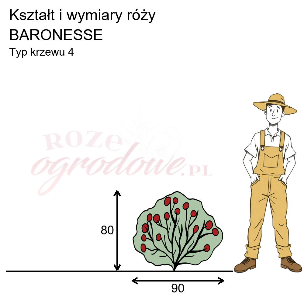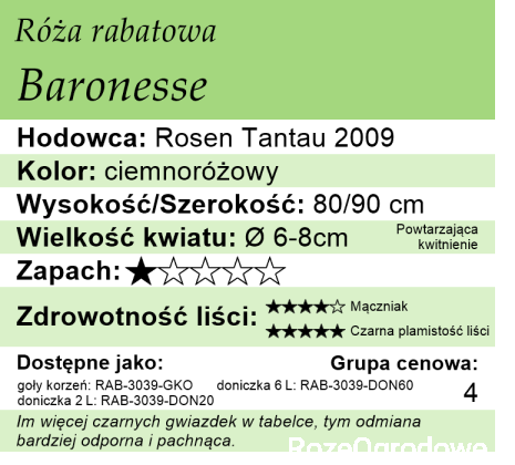 Baronesse to róża rabatowa o ciemno różowym kolorze. Jest ona młodszą siostrą odmiany Mariatheresia, a co za tym idzie ma do niej zbliżony charakter wzrostu.