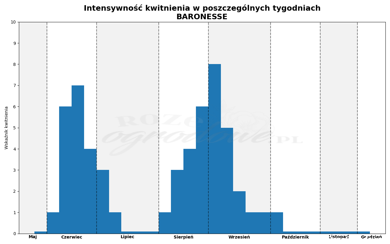 Baronesse odznacza się wyjątkową odpornością na choroby grzybowe dzięki czemu można ją polecić zarówno do prywatnych ogrodów jak i do dużych nasadzeń miejskich. Świetnie prezentuje się sadzona wraz ze swoją jaśniejszą "siostrą" Mariatheresia. Obie te odmiany dobrze nadają się do uprawy w doniczkach.