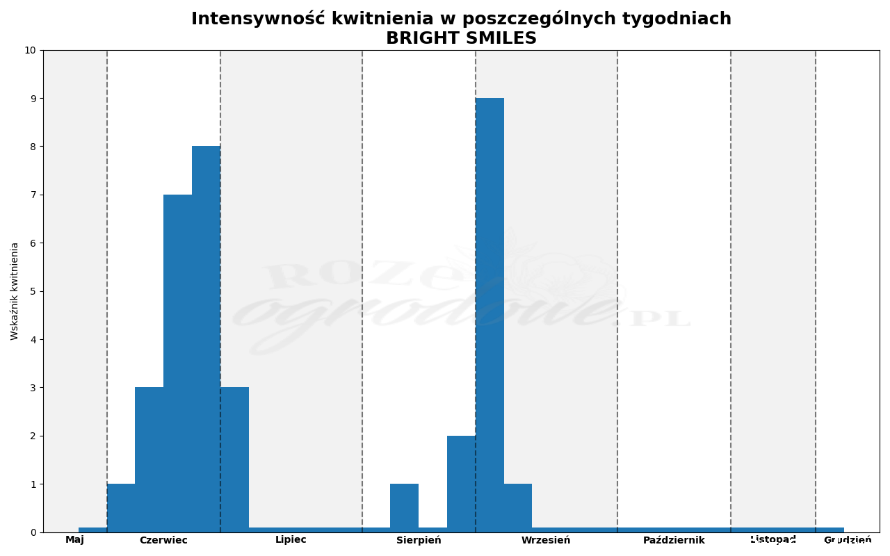 Bright Smiles to nowa róża rabatowa, zdobywająca coraz lepsze opinie wśród klientów. Zyskuje uznanie przede wszystkim za imponujący wigor, obfite kwitnienie, nadzwyczajną zdrowotność oraz stabilność koloru kwiatów.