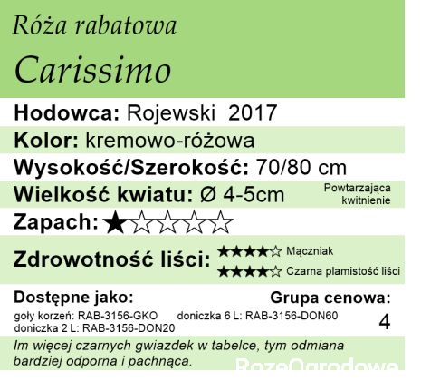 'Carissimo' jest znakomita do doniczek i na fronty rabat. Początkowo pąki mają kształt pomponu, później rozwijają swoje pełne płatków wnętrza, nabierając więcej różowego odcienia. ‘Carissimo’ posiada rzadko spotykaną cechę u róż o tak dużej ilości płatków; mianowicie przy sprzyjającej pogodzie, sama się oczyszcza. Jest to róża rabatowa, która dzięki nowoczesnej formie i staromodnym kwiatom łączy to co najlepsze w różach. Romantyzm i funkcjonalność.