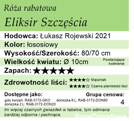 Eliksir Szczęścia to róża rabatowa, która powtarza swoje kwitnienie. Kwiaty tej róży są pachnące i pełne w kolorze łososiowym. Wysokość tej róży osiąga 70-80 cm. Róża ta jest odporna na choroby .