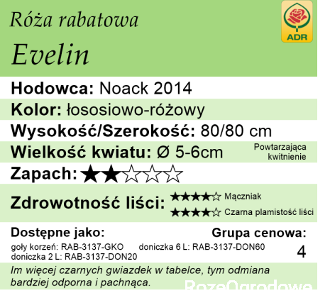 Dodatkowym atutem są piękne, ciemnozielone, błyszczące liście, które nie tylko uzupełniają estetykę kwiatów, ale także świadczą o zdrowiu rośliny. Róża Evelin zyskała uznanie ekspertów, zdobywając prestiżowe wyróżnienie ADR w 2014 roku.