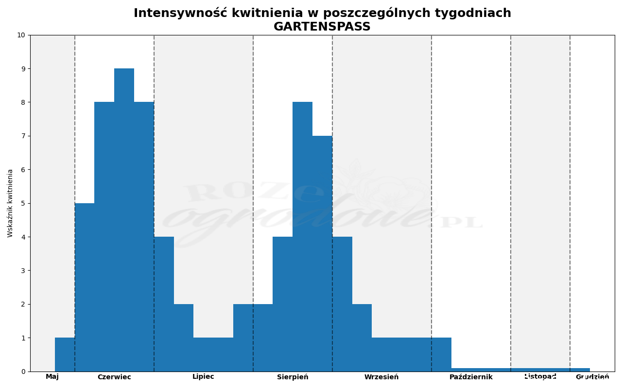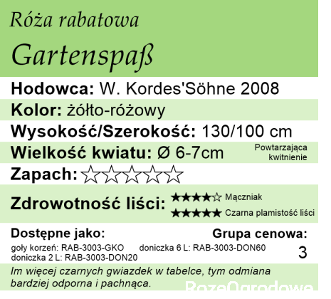 Gartenspaß to tak naprawdę pierwsza odmiana w tym kolorze, która oprócz wysokiej zdrowotności oferuje bardzo obfite i długie kwitnienie trwające do późnej jesieni.