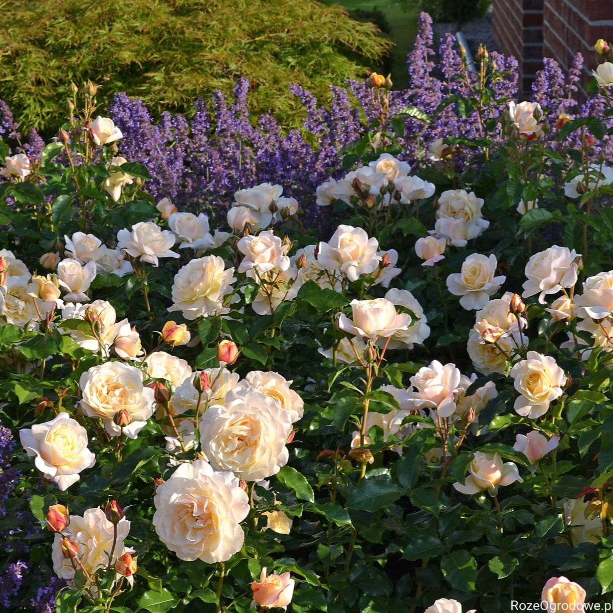 Hermann Hesse Rose - to poezja dla ogrodu. Liczne podwójne kwiaty tej róży rabatowej różnią się odcieniami od kremowobiałego przez różowy do delikatnego odcienia miodu.