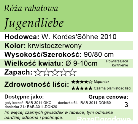 Jugendliebe spełni wymagania osób szukających róż rabatowych o dużych i pełnych kwiatach w tym kolorze, ponieważ poza tą odmianą ciężko znaleźć róże o tych parametrach, równocześnie zachowujące wysoką zdrowotność.
