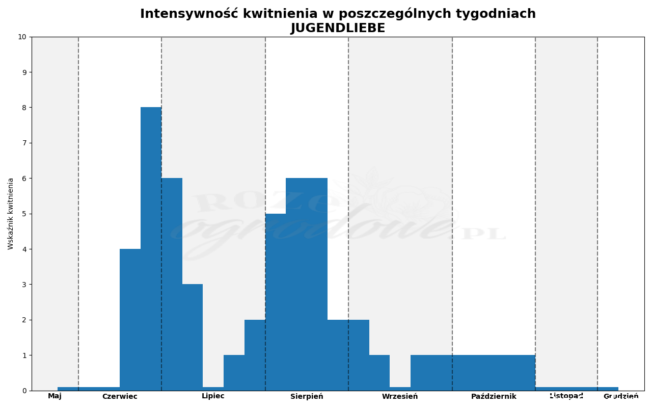 Jugendliebe jest różą późną, zakwitła dopiero w trzecim tygodniu czerwca ale już z dużą mocą. Na koniec czerwca osiągnęła pełnię kwitnienia, zakwitło aż 80% pąków. Kwiaty utrzymywały się jeszcze w sporej ilości przez dwa tygodnie. W połowie lipca nastąpiła tygodniowa przerwa między kwitnieniami, następnie powoli pojawiało się coraz więcej kwiatów. Sierpień przywitał nas obfitym kwitnieniem na poziomie 40%, w drugim i trzecim tygodniu Jugendliebe miała drugą pełnię kwitnienia, trochę słabszą niż pierwszą. Drugie kwitnienie było mocniej rozciągnięte, trwało osiem tygodni, drugie tyle co pierwsze. Po krótkiej przerwie w połowie września znów pojawiły się pojedyncze kwiaty, obserwowaliśmy je jeszcze do końca października.