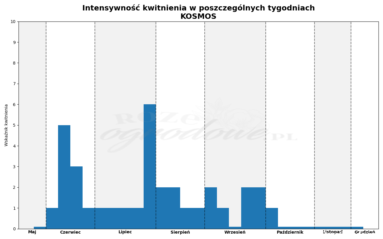 Stworzyliśmy wykres, opracowany dzięki cotygodniowym obserwacjom od maja do listopada 2025, który czytelnie pokazuje jak wygląda kwitnienie tej róży w naszych warunkach. Pierwsze kwiaty pojawiły się początkiem czerwca. Już w drugim tygodniu Kosmos osiągnął pełnię kwitnienia na poziomie 50%. Jeszcze w kolejnym tygodniu kwiatów było sporo a od ostatniego tygodnia czerwca do czwartego tygodnia lipca tylko pojedyncze. Zakwitł mocno i gwałtownie na koniec lipca. Drugi rzut był mocniejszy niż pierwszy ale równie nietrwały. W sierpniu i wrześniu kwitło do 20% pąków, ostatanie pojawiły się w pierwszym tygodniu października.