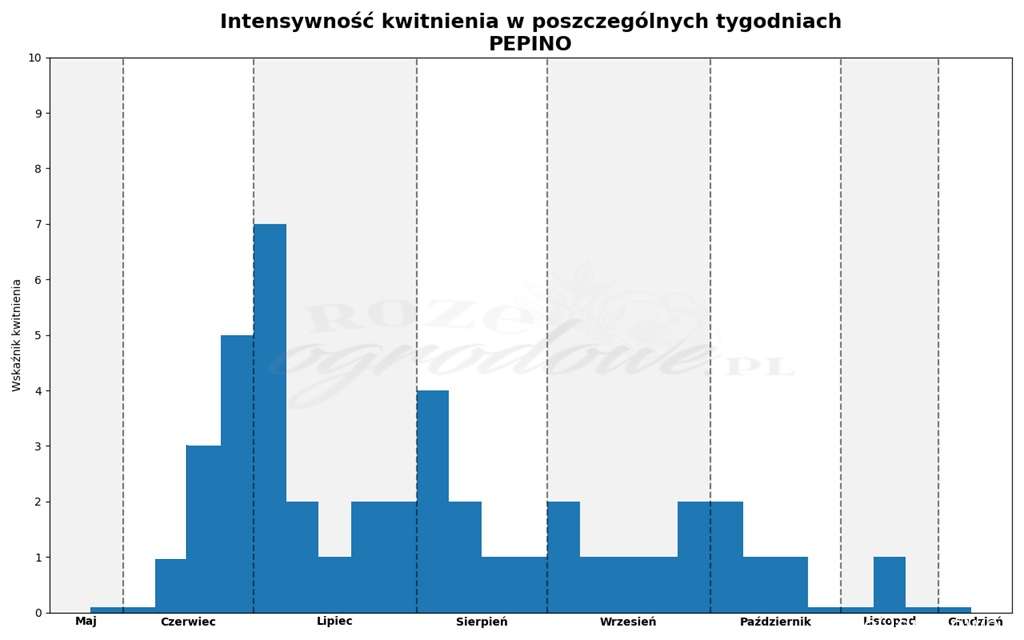 W sezonie 2025 dokonaliśmy obserwacji, dzięki którym możemy przedstawić wykres kwitnienia róży Pepino w poszczególnych tygodniach, od maja aż do początku grudnia. Zaliczyliśmy ją do róż późnych. Pierwsze kwiaty zaobserwowaliśmy w drugim tygodniu czerwca, ale pełnia kwitnienia przypadła na pierwszy tydzień lipca. Pepino ma ciekawy wykres kwitnienia, rozciąga je na cały sezon, bez przerw. Poza pierwszym mocnym pikiem w lipcu odnotowaliśmy jeszcze jeden na początku sierpnia. Poza tymi okresami kwitnienie było stabilne i niezbyt obfite ale co ważne - stałe, na poziomie 10-20% kwitnących pąków aż do mrozów.