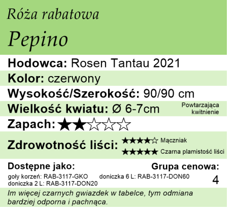 Róża rabatowa Pepino to bardzo interesująca, nowa odmiana o ciemnoczerwonej barwie . Kolor jest bardzo intensywny, mocny, głęboki, trwały, który nie blaknie brzydko na słońcu. Pąki kwiatów są średniej wielkości około 6-7 cm, pełne o kształcie pomponowym. Jest to odmiana samooczyszczająca się co oznacza że, przekwitłe płatki same opadają, co ułatwia pielęgnację i sprawia, że krzew wygląda schludnie. Kwiaty są bardzo trwałe i odporne na choroby. Róża Pepino nie pachnie praktycznie wcale . Jest to róża dla oka, kwiaty zebrane są w bogate kwiatostany co daje efekt bukietu na jednym pędzie. Jest to róża zwarta , dorastająca do 90 cm, krzewi się gęsto , tworząc kulisty kształt. Liście są zdrowe i ciemnozielone , błyszczące i lśniące które same w sobie stanowią walor dekoracyjny. Pepino wymaga stanowiska słonecznego. W pełnym słońcu będzie kwitła najobficiej, ale poradzi sobie też w lekkim półcieniu. Pepino najlepiej sprawdza się: na brzegi rabat, wzdłuż ścieżek i chodników, na żywopłoty, aby uzyskać efekt zwartego dywanu kwiatów, sadź ją w rozstawie co ok. 40–50 cm (ok. 4–5 sztuk na metr kwadratowy). Jest to odmiana hodowli Rosen Tantau, wprowadzona do sprzedaży w 2021 roku.