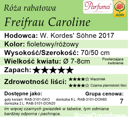 Freifrau Caroline, Baronowa Karolina to wyjątkowa róża rabatowa, wyróżniająca się intensywnym zapachem i dużymi, pełnymi rozetowatymi kwiatami o niezwykłym fuksjowym kolorze. Wśród róż rabatowych rzadko spotyka się odmiany o tak silnym aromacie, co czyni Freifrau Caroline szczególnie atrakcyjną.