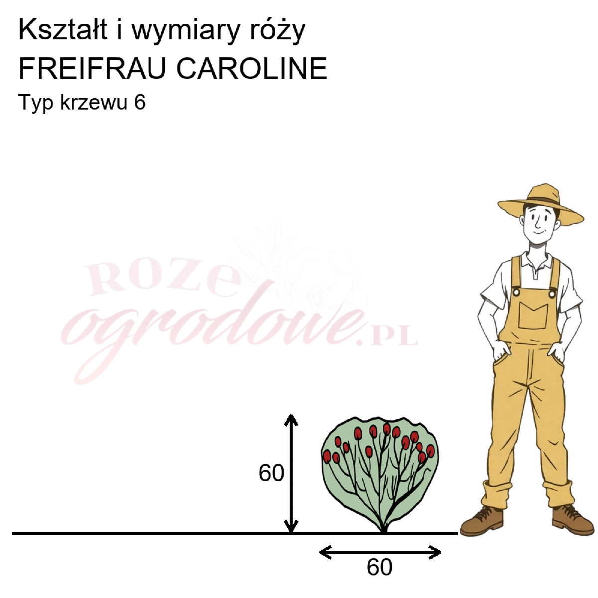Rysunek przedstawia wymiary i pokrój róży rabatowej Freifrau Caroline na podstawie naszych wewnętrznych obserwacji 3-letniego krzewu rosnącego na terenie szkółki, w Żywym Katalogu Róż. Zaklasyfikowaliśmy tę różę do typu 6. z 17. różnych typów opisowo-obrazkowych, które opracowaliśmy by pomóc w lepszym doborze róż. Można je zobaczyć tutaj: https://www.rozeogrodowe.pl/pl/i/TYPY-ROZ/53