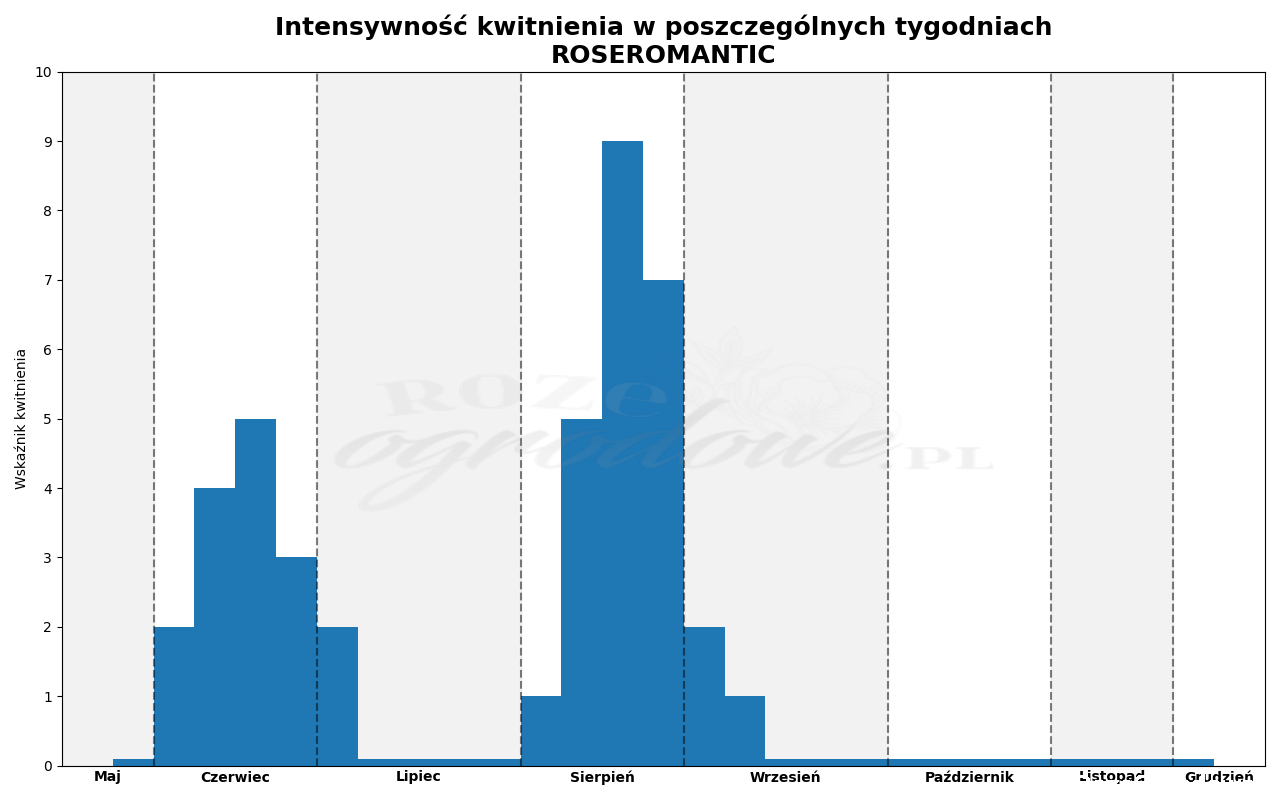Roseromantic zakwita w normalnym, standardowym terminie. Około 20% pąków zakwitło w pierwszym tygodniu czerwca. Stopniowo pojawiało się ich więcej aż do pełni pierwszego kwitnienia w trzecim tygodniu. Kwitnienie trwało pięć tygodni i było średnio obfite. Po nim nastąpiła przerwa czterotygodniowa kiedy na krzewie nic nie kwitło ale jak już wspomniałam wyżej, w opisie pokroju, nie wpłynęło to znacząco na dekoracyjność tego krzewu. Ponownie zakwitła w pierwszym tygodniu sierpnia, znów w trzy tygodnie osiągnęła szczyt kwitnienia, najwyższy w całym sezonie, na poziomie 90% kwitnących pąków. Kolejne tygodnie do połowy września produkowała jeszcze kwiaty. Drugie kwitnienie było dłuższe o tydzień i zdecydowanie bardziej obfite.