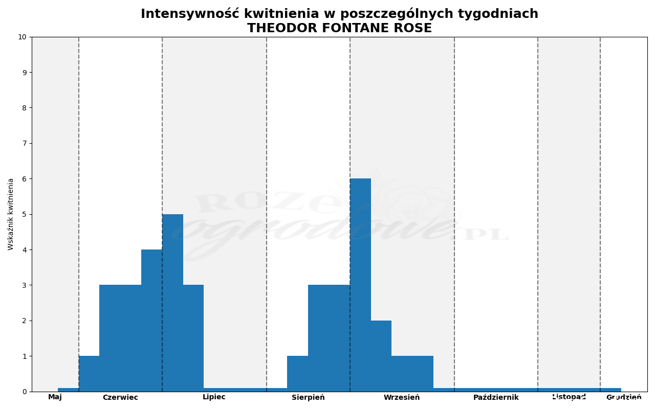 Theodor Fontane Rose zaliczyliśmy do róż późnych. Pierwsze kwiaty pojawiły się co prawda na początku czerwca ale pełnia kwitnienia przypadła na pierwszy tydzień lipca. Pierwsze kwitnienie trwało sześć tygodni, było umiarkowane. Od trzeciego tygodnia lipca do początku sierpnia na krzewie nie było kwiatów lub było ich mniej niż 10% więc nie odnotowaliśmy. W drugim tygodniu sierpnia ponownie zakwitł. W pierwszym tygodniu września miał szczyt kwitnienia, najwyższy w całym sezonie, kwitło 60% pąków. Drugie kwitnienie trwało siedem tygodni, niemal do końca września.