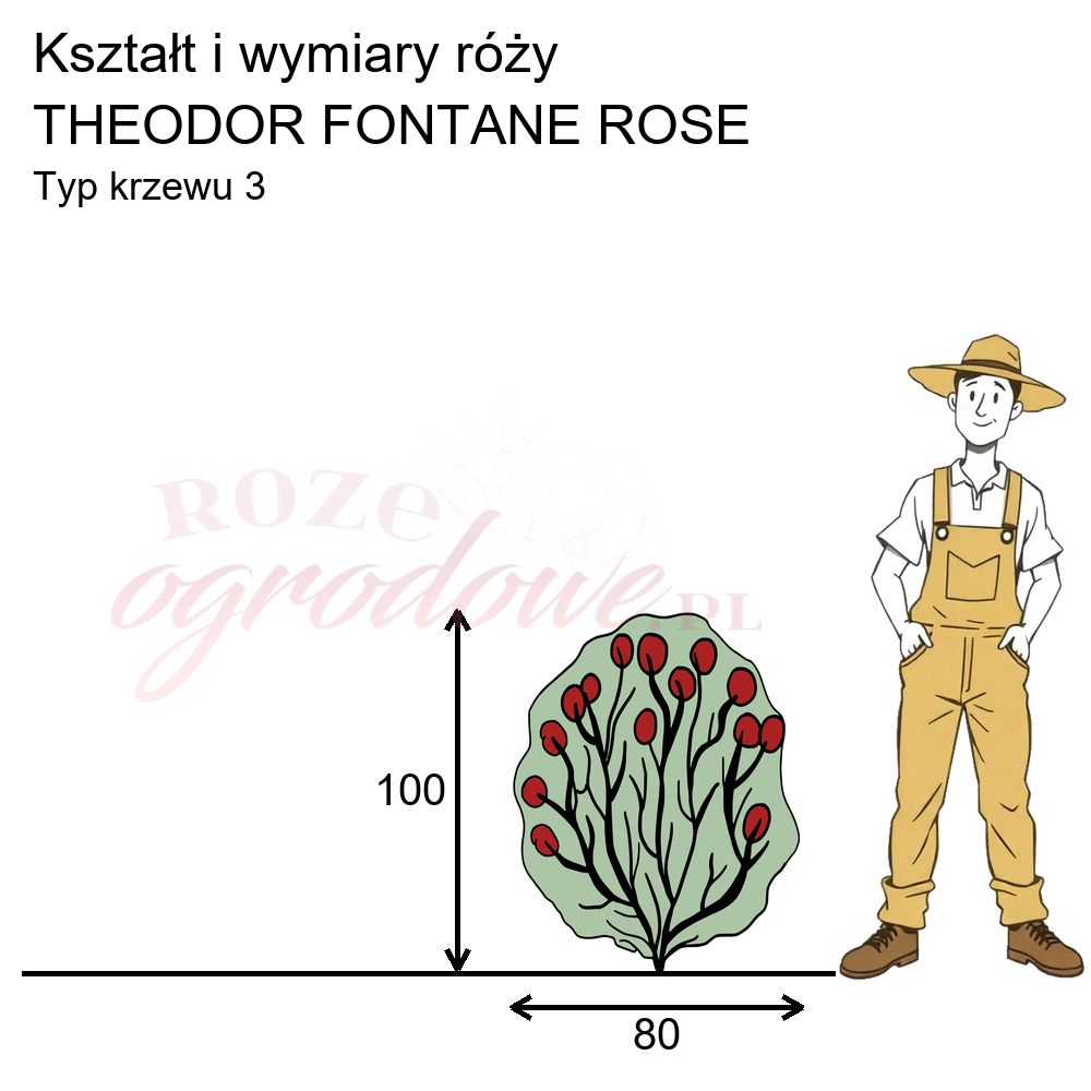 Rysunek przedstawia wymiary i pokrój róży rabatowej Theodor Fontane Rose na podstawie naszych wewnętrznych obserwacji 3-letniego krzewu rosnącego na terenie szkółki, w Żywym Katalogu Róż. Zaklasyfikowaliśmy tę różę do typu 3. z 17. różnych typów opisowo-obrazkowych, które opracowaliśmy by pomóc w lepszym doborze róż. Można je zobaczyć tutaj: https://www.rozeogrodowe.pl/pl/i/TYPY-ROZ/53