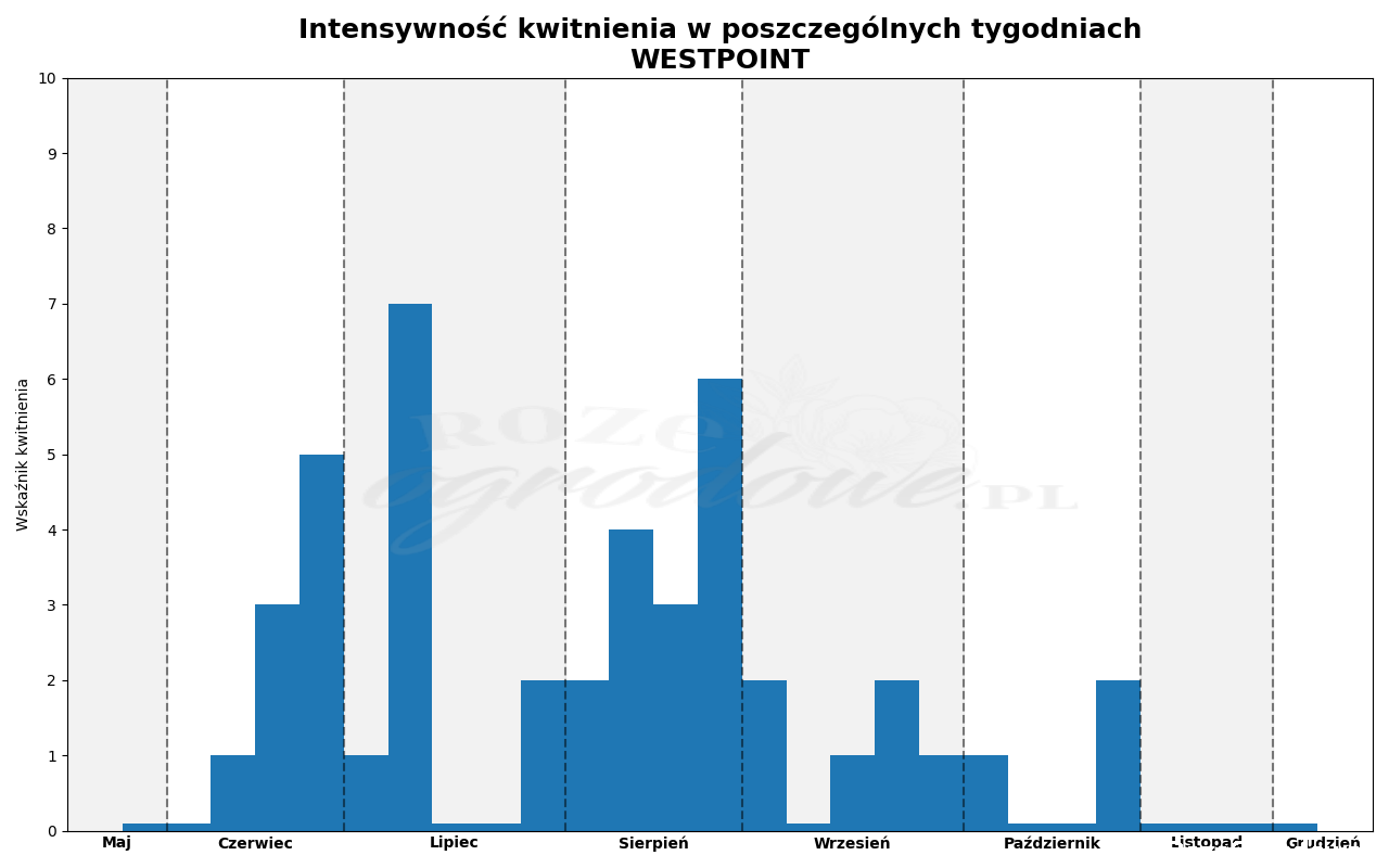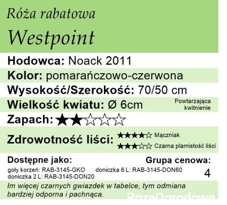 Westpoint to wyjątkowa róża która ma wyrazisty kolor kwiatów, przyciąga uwagę wszystkich niczym latarnia morska. Jest to odcień czerwieni, intensywny, ceglastoczerwony który nie blaknie na słońcu. Środek kwiatu jest żółty z wyraźnymi pręcikami, a to oznacza że owady same się gną. Kwiaty są półpełne. Kwitnienie rozpoczyna się już pod koniec maja i kwitnie praktycznie jednym ciągiem aż do pierwszych przymrozków. Przekwitłe kwiaty same opadają. Krzew rośnie niski, ale gęsty, zwarty. Westpoint posiada zdolność do silnego krzewienia się od samej podstawy. Liście są drobne, błyszczące, ciemnozielone, pokrywają one dużą część krzewu. Jest to odmiana o bardzo wysokiej odporności na czarną plamistość i mączniaka.