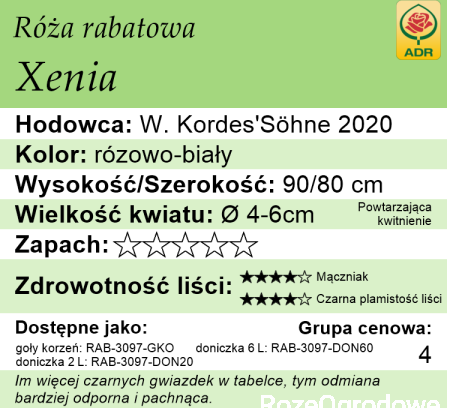 Co równie istotne, Xenia to róża o wybitnej zdrowotności, nie wymagająca specjalnej troski. Nawet początkujący ogrodnicy osiągną z nią świetne rezultaty. Można ją z powodzeniem posadzić zarówno na obszernej rabacie w dużym parku miejskim, jak i w doniczce na niewielkim balkonie. Pomimo swojego bujnego wzrostu, Xenia zachowuje rozsądne wymiary. To wszystko sprawia, że zasłużyła na certyfikat ADR, będący uznanym wyróżnieniem dla tej wyjątkowej rośliny.