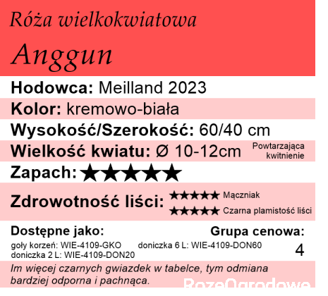 Anggun to róża, która zdobyła uznanie za swoją elegancję i zapach . Jest on intensywny, świeży a zarazem owocowy z nuta mięty pieprzowej. Można wyczuć w nim nuty herbaty różanej połączonej z cytrusami. Jest to jej największy atut. Płatki są delikatne i aksamitne w porcelanowym kremowym kolorze.
